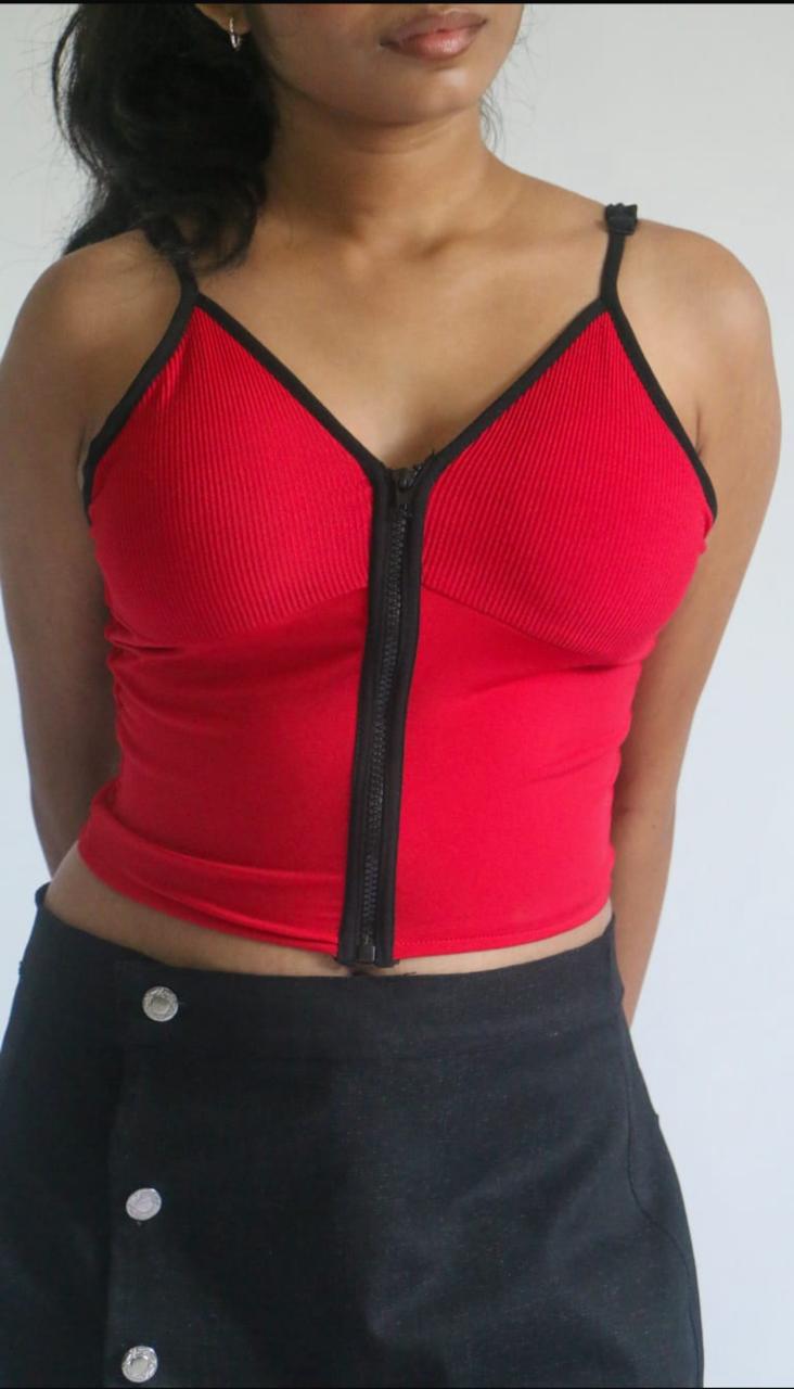 Vibrant and bold, this color block camisole crop top stands out with a front zipper and striking contrast panels. Made for fashion-forward looks, it offers both comfort and style. Ideal for parties, events, or confident everyday outfits, it pairs perfectly with jeans or cargos for an edgy finish.Additional information