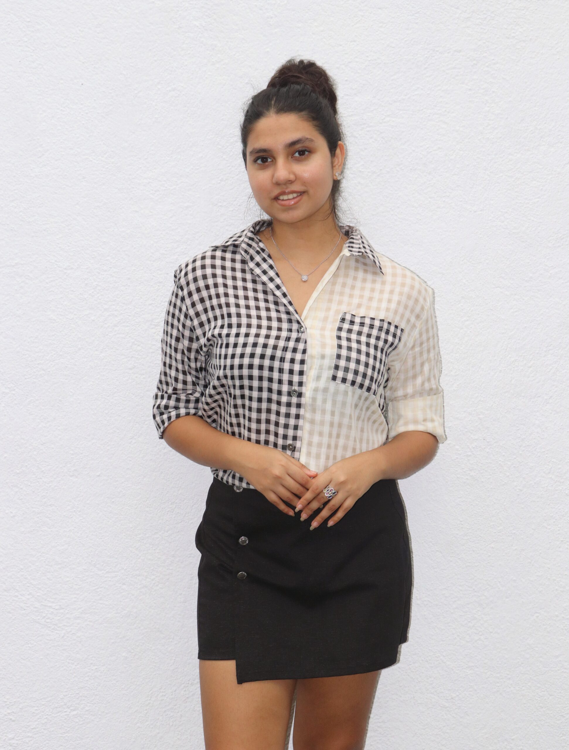 Playful meets polished. This two-tone gingham shirt with dropped shoulders adds instant edge to your everyday look.